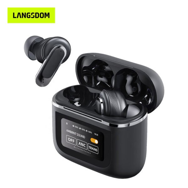 Auriculares Langsdom V8 con estuche interactivo y pantalla LED táctil a color. Ofrecen cancelación de ruido, conexión Bluetooth 5.4, sonido envolvente HiFi y hasta 20 horas de autonomía para disfrutar tu música sin interrupciones.