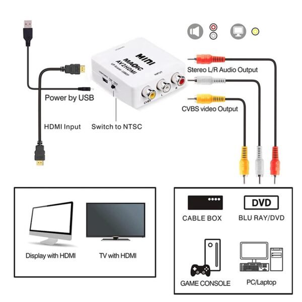 Convierte fácilmente tus dispositivos con salida RCA, CVBS o AV a HDMI en calidad Full HD 1080p. Ideal para reproducir consolas retro, DVD, VHS o cámaras en televisores modernos. Compacto, portátil y con alimentación por USB para mayor comodidad.