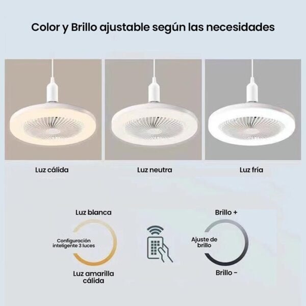 Gracias a su rosca universal E27, se instala en segundos como si fuera una bombilla convencional, sin herramientas ni cableado adicional. Incluye control remoto multifunción, que permite ajustar la intensidad de la luz, seleccionar entre luz cálida, neutra o fría, y controlar el ventilador con diferentes velocidades según la necesidad.