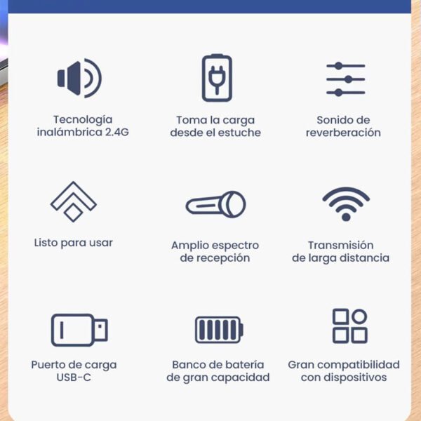 Gracias a su tecnología inalámbrica 2.4G y su micrófono de condensador omnidireccional, capta la voz con gran claridad y reduce el ruido ambiental, logrando un audio limpio incluso en entornos ruidosos.