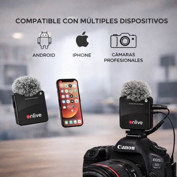El kit incluye dos micrófonos, ideal para entrevistas o grabaciones con más de una persona, y un receptor ultracompacto, compatible con iPhone (Lightning), Android (USB-C) y cámaras profesionales mediante jack 3.5 mm.