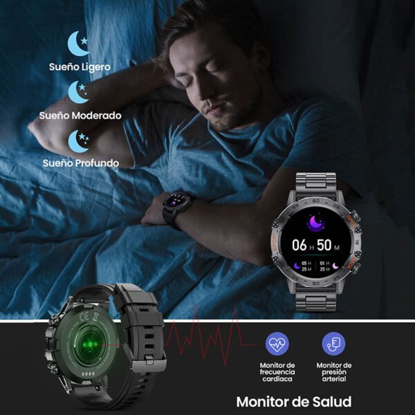 Además, incorpora un completo sistema de monitoreo de salud, capaz de medir frecuencia cardíaca, presión arterial y calidad del sueño, ayudándote a mantener un control más preciso de tu bienestar diario.