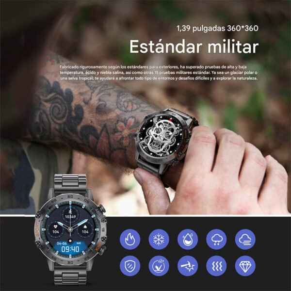 Smartwatch deportivo LIGE K52 con diseño metálico robusto, pantalla táctil de alta resolución 360×360, monitoreo de salud y resistencia IP68. Compatible con Android, incluye dos variantes de correa según modelo.