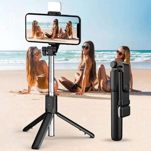 Palo de Selfie R1S con trípode y luz LED integrada. Extensible hasta 71 cm, rotación de 360° y compatible con todo tipo de smartphones. Perfecto para fotos y videos con mejor iluminación.