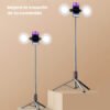 Soporte profesional con trípode telescópico y doble luz LED regulable. Ideal para grabar videos, hacer transmisiones o sacar selfies con iluminación perfecta. Altura ajustable hasta 1,70 m y control remoto Bluetooth.