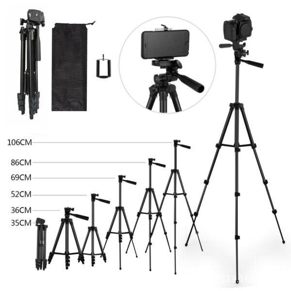 Con una altura máxima de 1,06 metros y mínima de 35 cm, ofrece gran versatilidad para diferentes ángulos y tomas. Incorpora perillas de bloqueo para un ajuste seguro y confiable, además de ser compatible con teléfonos móviles universales y cámaras compactas.